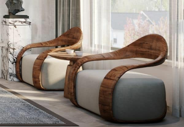 these chairs can honestly be called sexy… the lines and curves give depth and movement while that big over sized cushion lends it girth and weight. feels Solid and comfortable